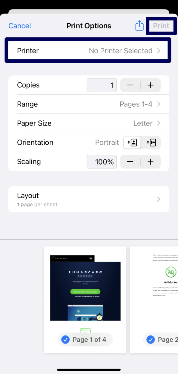 Select the area you'd like to print, and the number of copies, then tap "Print"