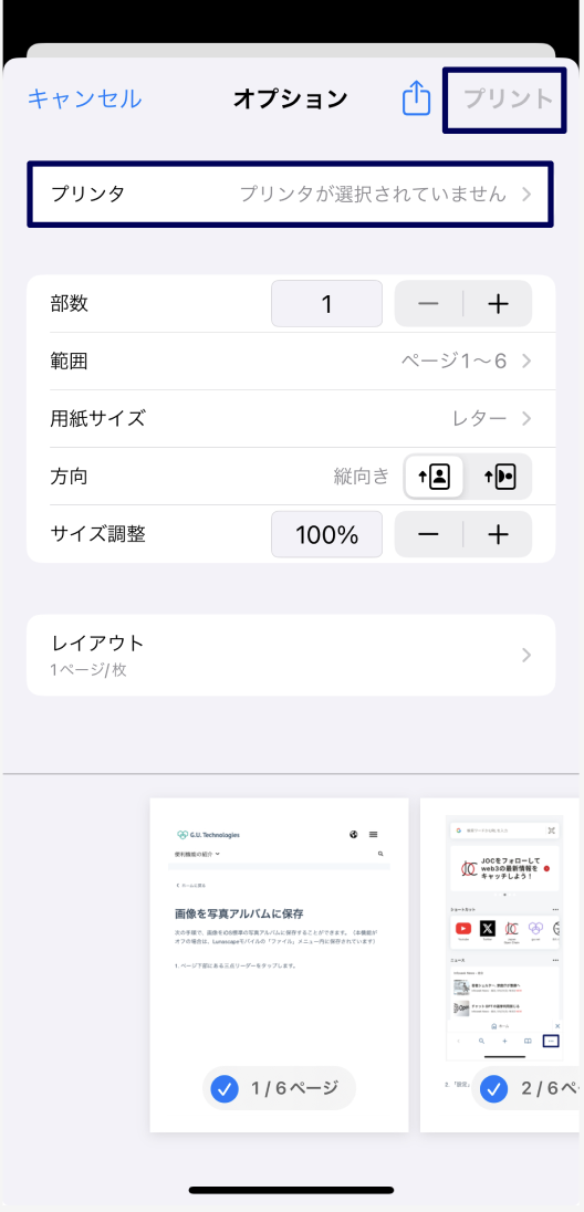 プリント範囲と部数を選択し、右上に表示される「プリント」をタップします。