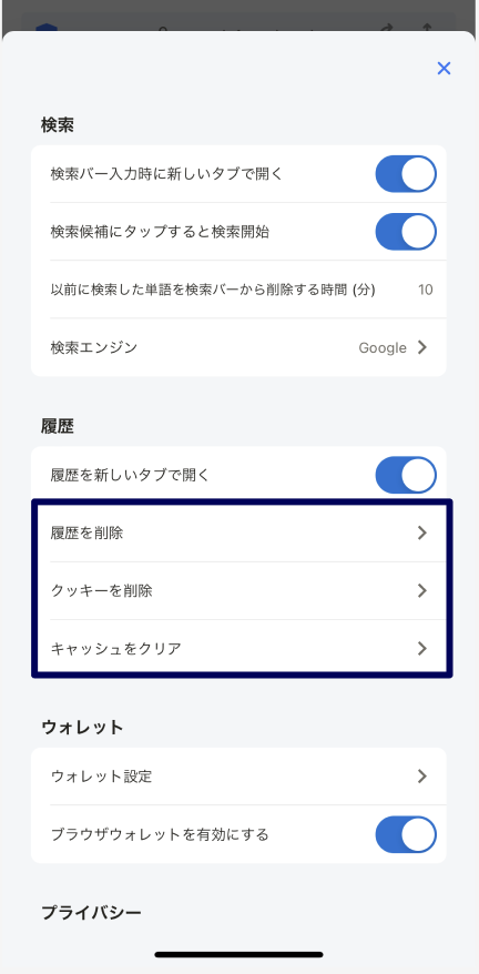 次の手順で、履歴、Cookie、キャッシュの消去を行うことができます。