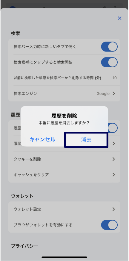 ◆履歴の削除の場合 4. 「履歴を削除」をタップし、「消去」をタップします。