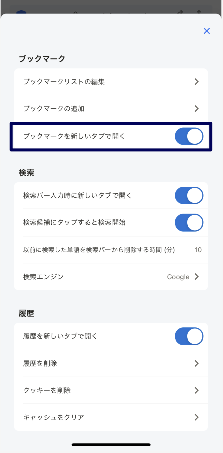便利な機能お気に入りを新しいタブで開くお気に入りを新しいタブで開く次の手順で、お気に入りを新しいタブで開くことができます。 ページ下部のメニューボタンをタップします。 「設定」をタップします。 3.「ブックマークを新しいタブで開く」をオンにします。