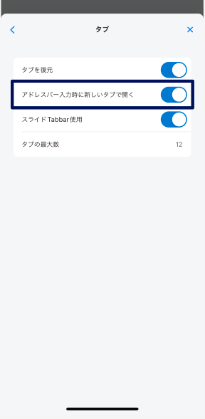 4.「アドレスバー入力時に新しいタブで開く」をオンにします。
