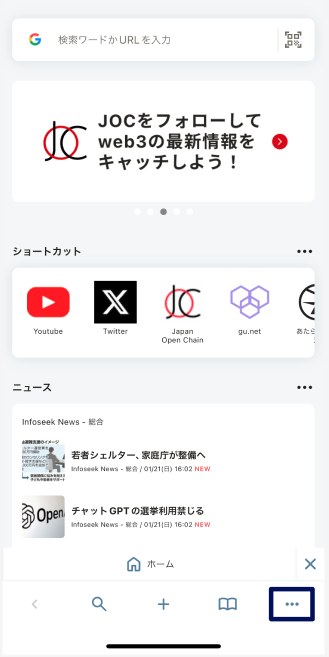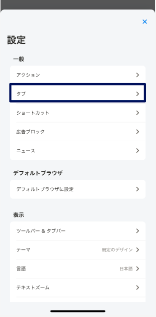 便利な機能前回のタブを復元前回のタブを復元次の手順で、前回のタブを復元することができます。※前回のタブを復元とは:Lunascapeモバイル終了後、再起動した際に前回開いていたタブを表示させる機能です。 ページ下部の三点リーダーをタップします。 「設定」をタップします。 「タブ」をタップします。 「タブを復元」をオンにします。