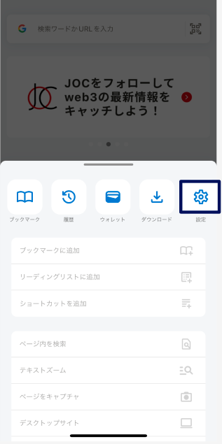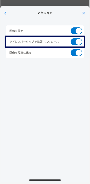 便利な機能上部タップで先頭にスクロール上部タップで先頭にスクロール次の手順で、画面上部をタップした際に先頭にスクロールすることができます。(iPadは常時オン) ページ下部にある三点リーダーをタップします。 「設定」をタップします。 3.「アクション」をタップします 。 「アドレスバータップで先頭へスクロール」をオンにします。